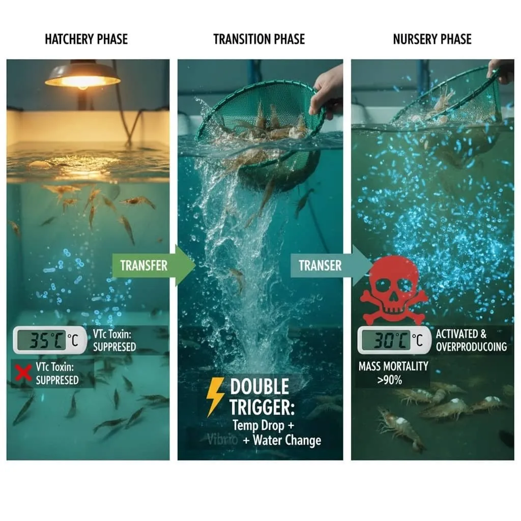 [2] VTc یک توکسین پروتئینی است که توسط سویه بیماریزای خاصی ازVibrio parahaemolyticus تولید میشود. این سم در واقع همان چیزی است که HLVD یا TPD را به یک بیماری فوقالعاده کشنده تبدیل میکند. ویژگیهای کلیدی VTc: -1 ماهیت: پروتئینی است و توسط ژنهای خاصی در باکتری رمزگذاری و تولید میشود. 2- اثرگذاری: به سلولهای بافتی در پستلاروهای میگو حمله کرده و باعث اختلال در عملکرد غشاهای سلولی میشود. این فرآیند نفوذپذیری غشا را تغییر میدهد، منجر به نشت مواد درونسلولی شده و در نهایت مرگ سلول را رقم میزند. 3- نشانهها در میگو: بهدلیل آسیب بافتی، بدن پستلاروها شفاف یا کمرنگ میشود (translucent appearance) و توان زندهمانی آنها به شدت کاهش مییابد. 4- سرعت اثر VTc: بسیار سریع عمل میکند؛ به همین دلیل مرگومیر گسترده در مدت زمان کوتاه (چند روز) دیده میشود.خود باکتری بدون تولید VTc خیلی خطرناک نیست؛ این سم است که باعث آسیب جدی میشود.